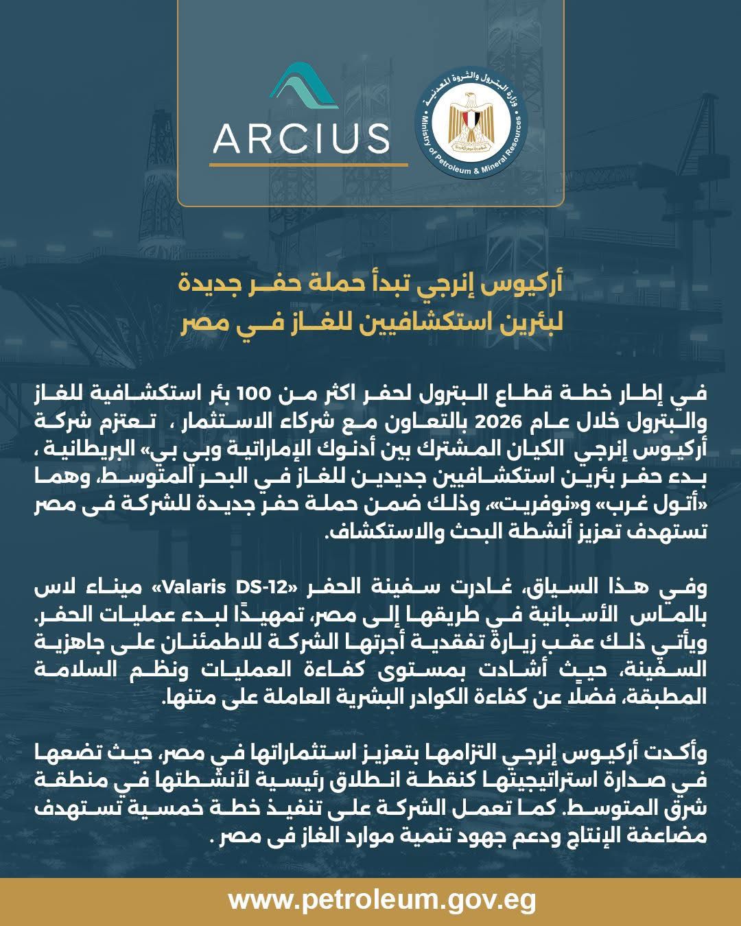 في إطار خطة قطاع البترول لحفر أكثر من 100 بئر استكشافية للغاز والبترول خلال عام 2026 بالتعاون مع شركاء الاستثمار ، تعتزم شركة أركيوس إنرجي الكيان المشترك بين أدنوك الإماراتية وبي بي البريطانية ، بدء حفر بئرين استكشافيين جديدين للغاز في البحر المتوسط، وهما «أتول غرب» و«نوفريت»، وذلك ضمن حملة حفر جديدة للشركة فى مصر تستهدف تعزيز أنشطة البحث والاستكشاف.