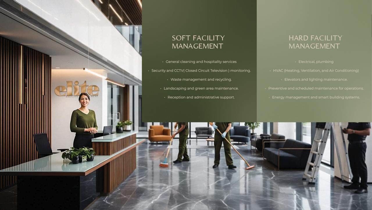 إدارة المرافق الخدمية (Soft FM): التنظيف والضيافة، الأمن والمراقبة، إدارة النفايات وإعادة التدوير، تنسيق الحدائق، وخدمات الاستقبال والدعم الإداري.