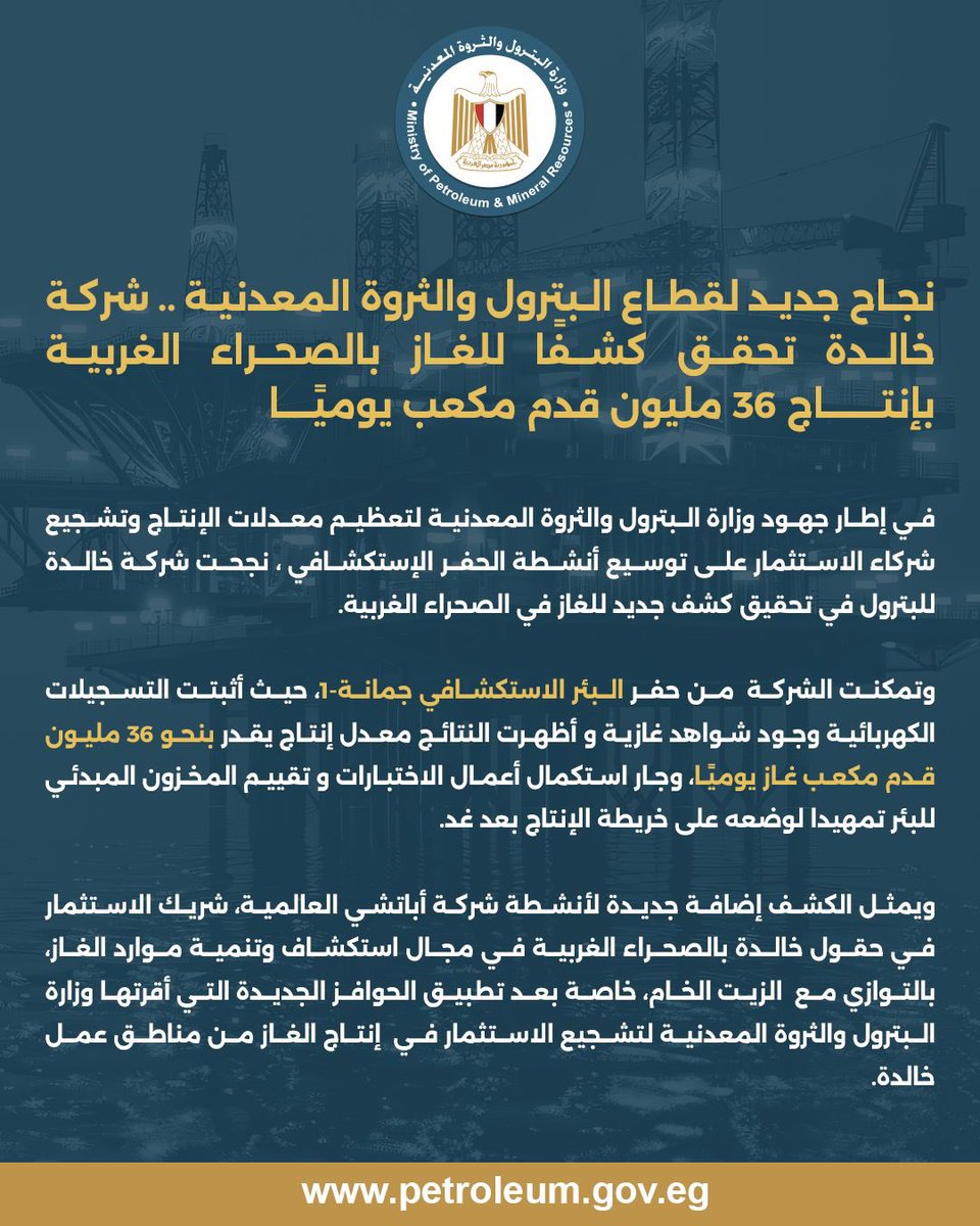 في إطار جهود وزارة البترول والثروة المعدنية لتعظيم معدلات الإنتاج وتشجيع شركاء الاستثمار على توسيع أنشطة الحفر الإستكشافي ، نجحت شركة خالدة للبترول في تحقيق كشف جديد للغاز في الصحراء الغربية.