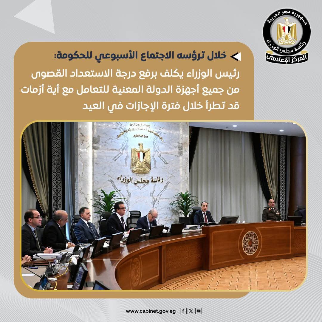 وكلّف مدبولي جميع أجهزة الدولة المعنية برفع درجة الاستعداد القصوى لمواجهة أي أزمات محتملة خلال فترة الإجازة، خاصة مع توقعات سقوط أمطار وسيول في بعض المناطق، مع التأكيد على الرقابة المشددة على الأسواق لضمان توافر السلع الاستراتيجية ومنع أي تلاعب بالأسعار أو إخفاء منتجات. كما شدد على التصدي لكل محاولات التعدي على أملاك الدولة أو البناء على الأراضي الزراعية أو المخالف، وتفعيل غرف الأزمات بالوزارات والمحافظات.