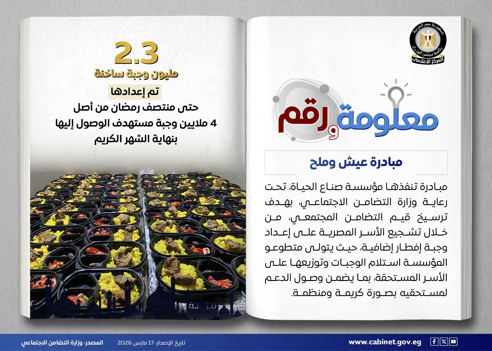 أطلقت مؤسسة صناع الحياة، تحت رعاية وزارة التضامن الاجتماعي، المرحلة الثانية من مبادرة «عيش وملح» للعام الثاني على التوالي، بهدف تعزيز قيم التكافل المجتمعي وتشجيع الأسر المصرية على إعداد وجبة إفطار إضافية خلال شهر رمضان.