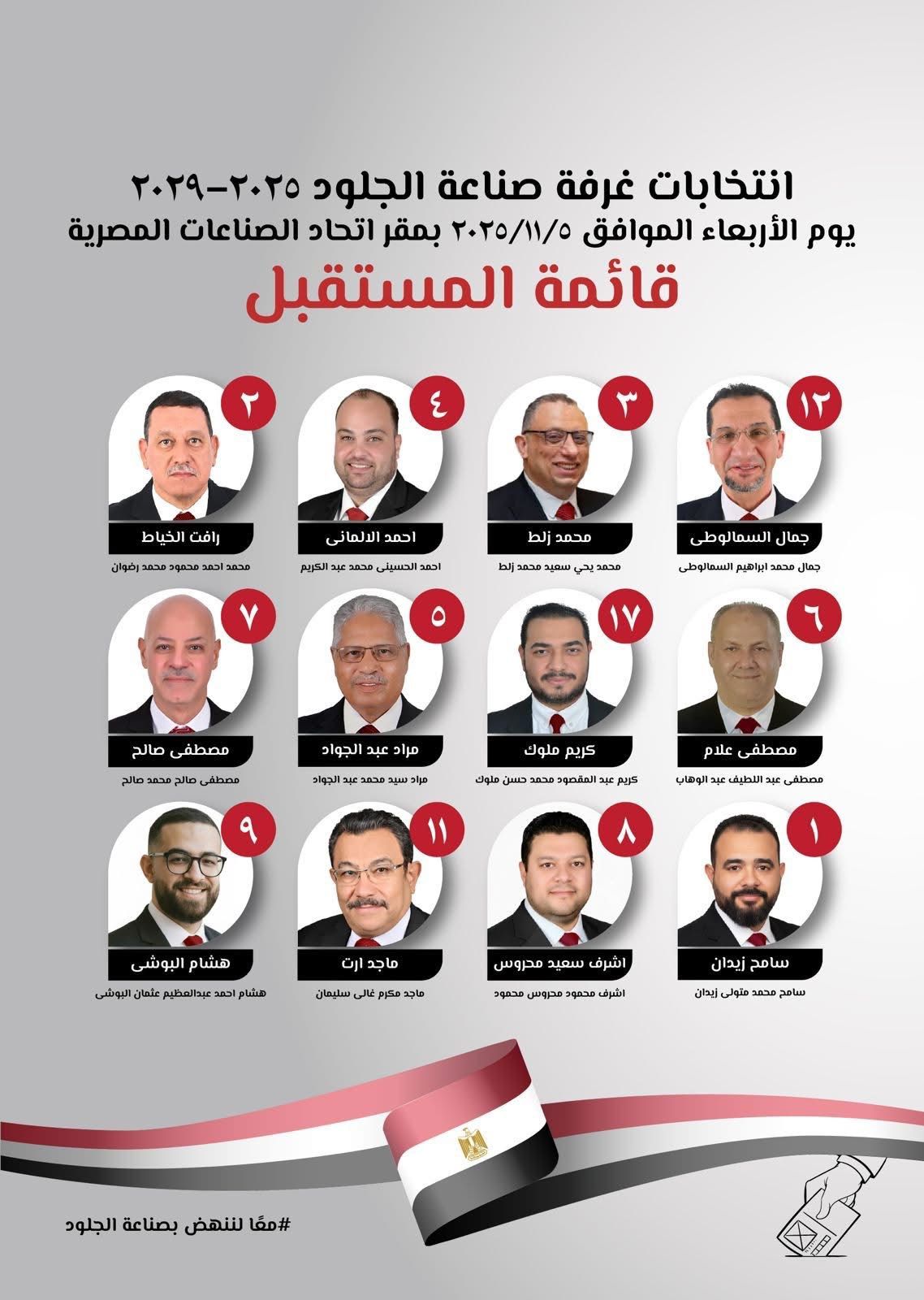 وتضم قائمة المستقبل لانتخابات غرفة صناعة الجلود، جمال السمالوطي، محمد زلط، أحمد الألماني، رأفت الخياط، مصطفى علام، كريم ملوك، مراد عبدالجواد، مصطفى صالح، سامح زيدان، أشرف سعيد محروس، ماجد آرت، و هشام البوشي.